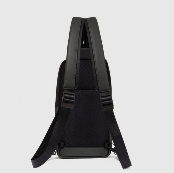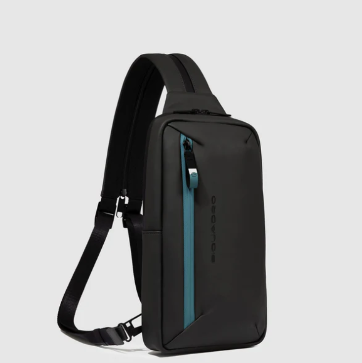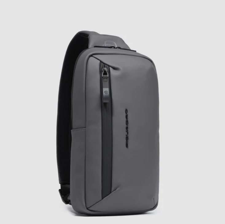 Il monospalla della linea Corner 2.0 (qui tutto il catalogo disponibile su Romano Pelletterie online e in store), è la soluzione ideale per chi cerca massima libertà di movimento senza rinunciare alla tecnologia. Rispetto alla versione zaino, questo modello offre un design più snello e versatile, perfetto per l'uso quotidiano o come borsa da viaggio ultra-leggera. Realizzato in tessuto gommato riciclato, garantisce un'elevata resistenza all'acqua e una lunga durata nel tempo. Grazie allo spallaccio regolabile e apribile, può essere indossato comodamente sia a destra che a sinistra, adattandosi perfettamente alla tua postura.Nonostante le dimensioni ridotte, dispone di uno scomparto dedicato per iPad® e una tasca frontale con zip per gli oggetti di uso frequente. Integra il sistema di protezione anti-RFID  per prevenire il furto di dati dalle carte di credito e un'asola frontale per l'aggancio di luci LED o moschettoni. L'articolo va ad aggiungersi come pezzo irrinunciabile della linea Eco-Friendly poichè realizzato con materiali sostenibili e certificato Carbon Neutral, unendo l'innovazione Piquadro al rispetto per l'ambiente.