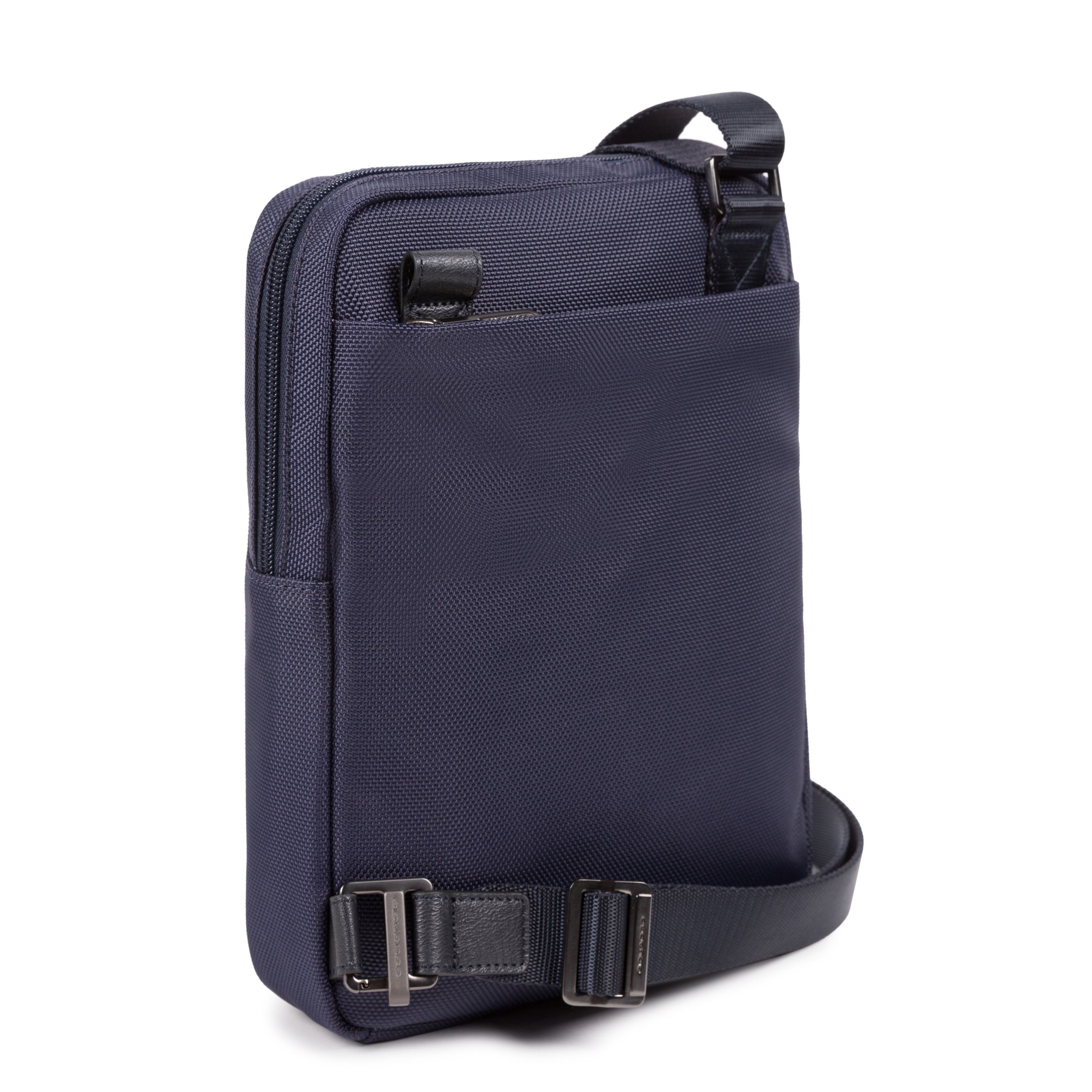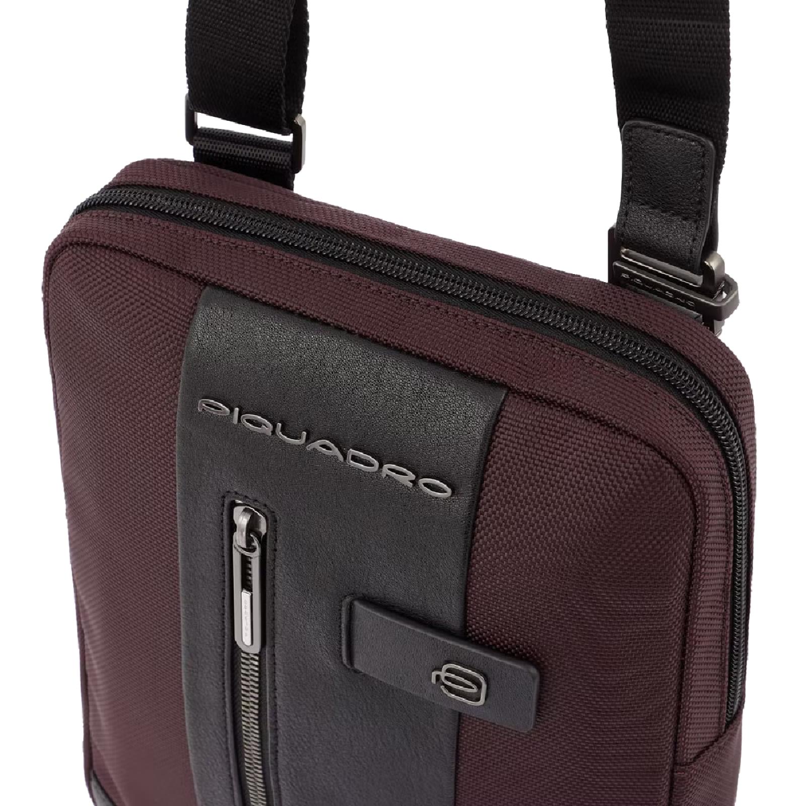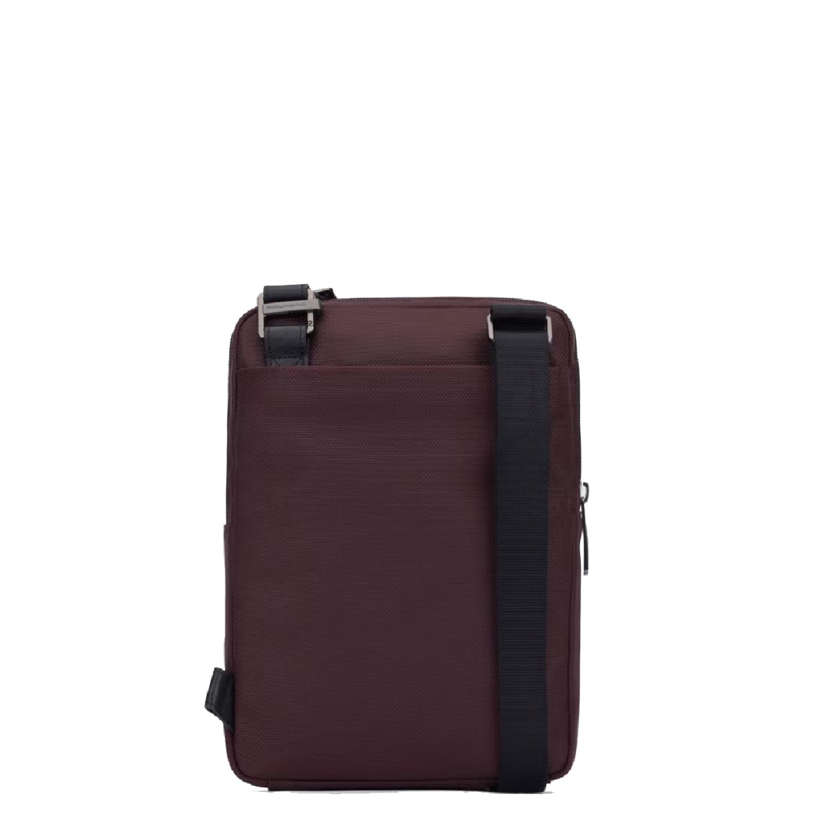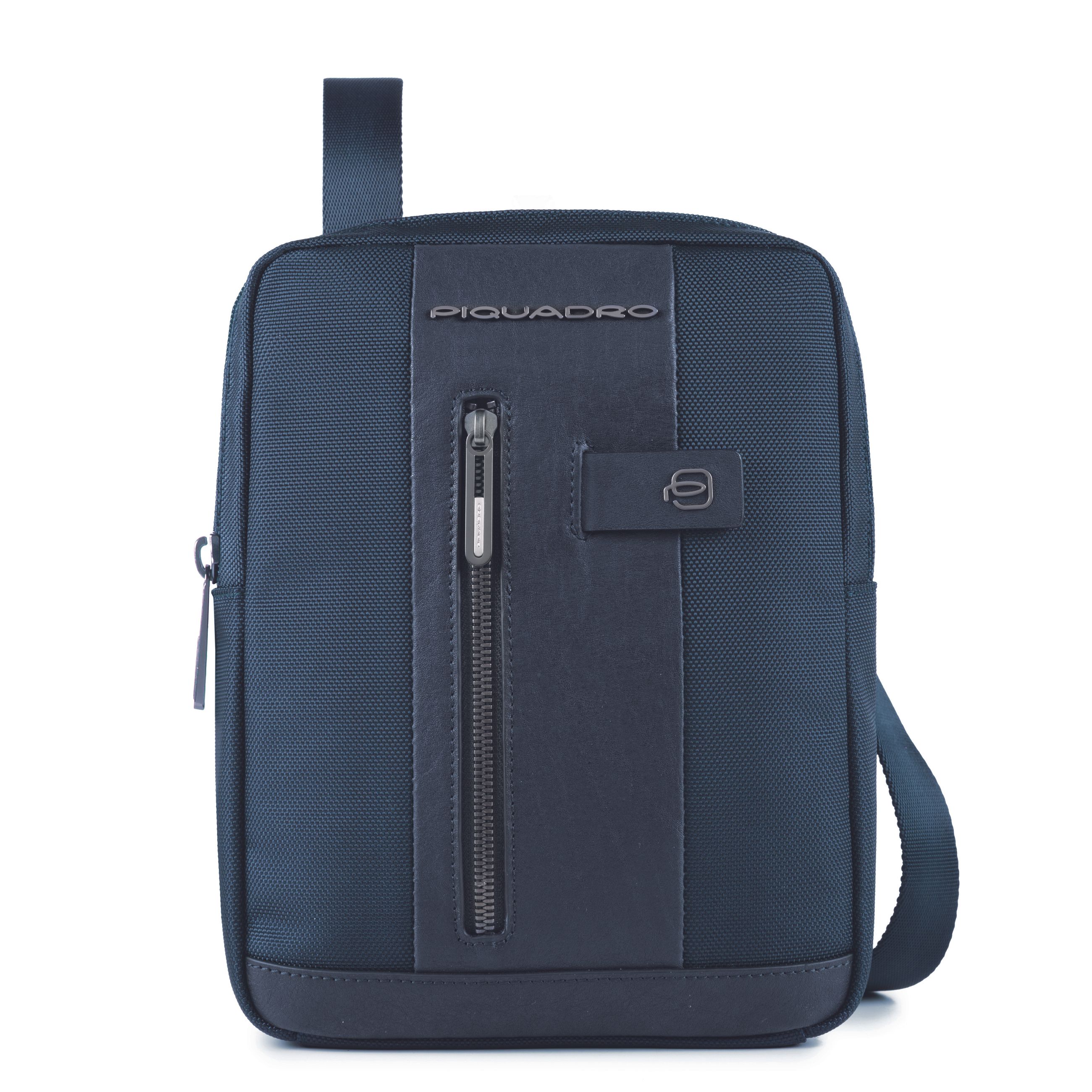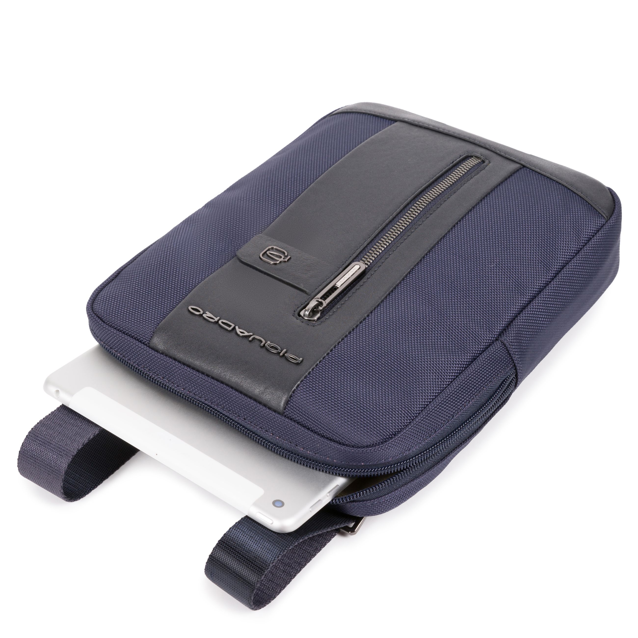 Borsello porta iPad®mini in tessuto riciclato con dettagli in pelle. Funzionale e pratico accessorio maschile con tracolla regolabile, taschino frontale con cerniera e ampio comparto principale, con zip e tasche interne.