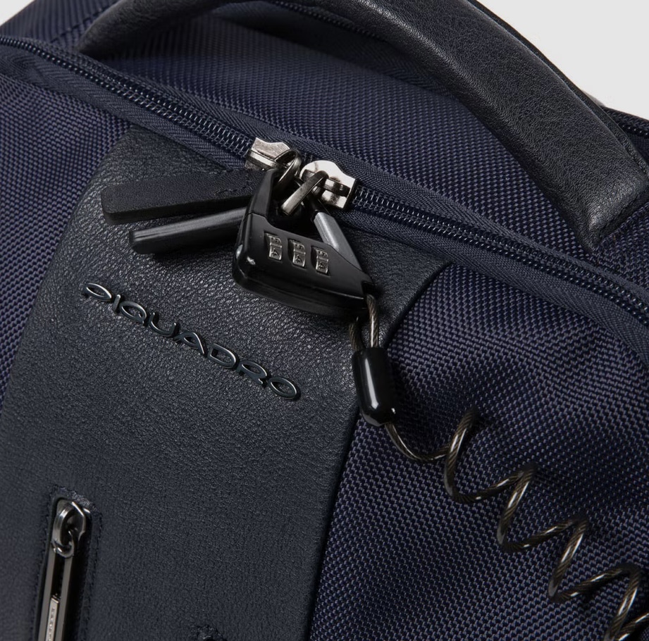 Zaino porta pc da 15.6" in tessuto e pelle. Chiuso con doppia zip, internamente imbottito per contenere il pc e tutti gli accessori work nei vari taschini. Tasca porta ombrello, fascetta sullo schienale per agganciarlo al trolley.