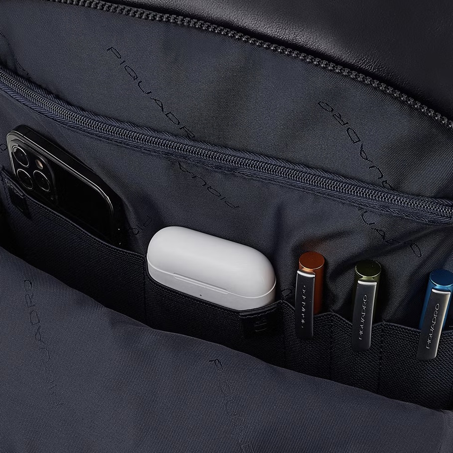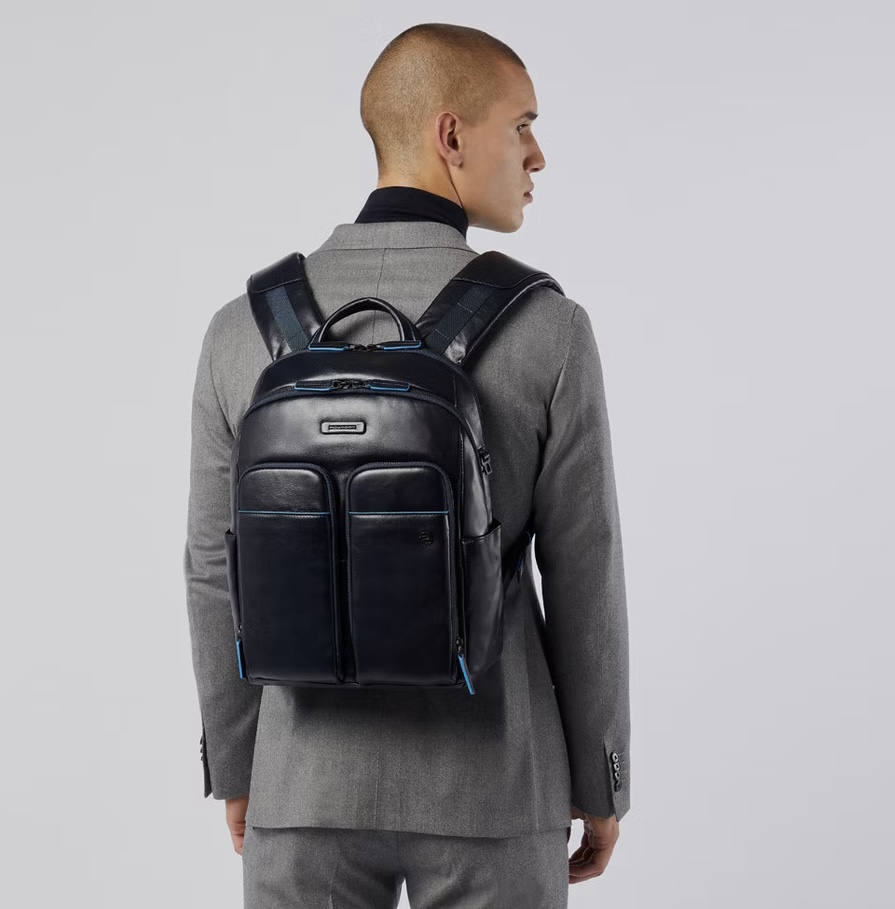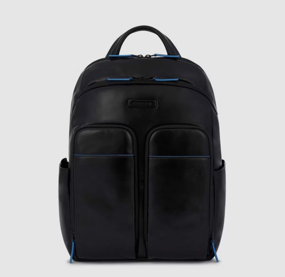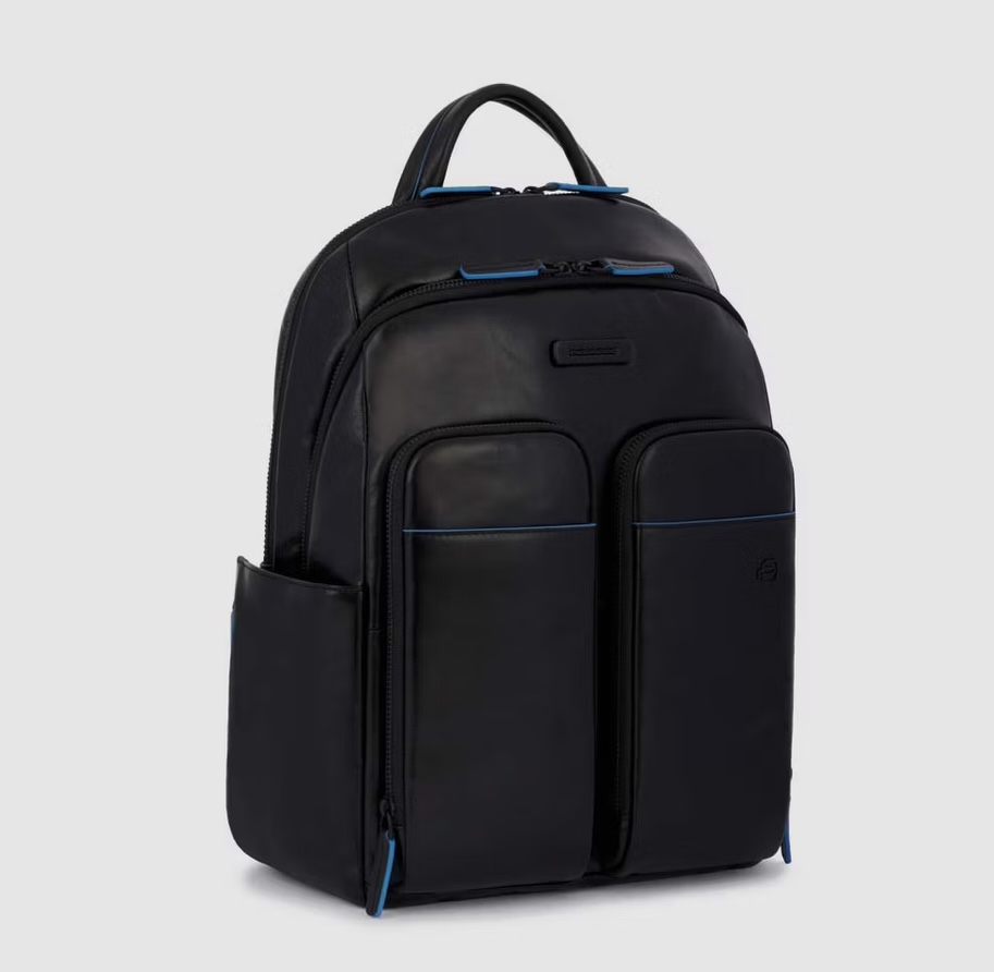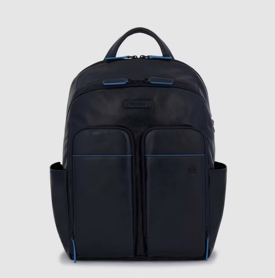 Zaino in pelle porta pc da 14". Chiuso da due zip, internamente imbottito per contenere il pc e tutti gli accessori work nei vari taschini. Sul davanti due tasche chiuse con cerniera, sullo schienale fascetta per agganciarlo al trolley e due tasche chiuse con zip sui lati per riporre l'ombrello o la borraccia.