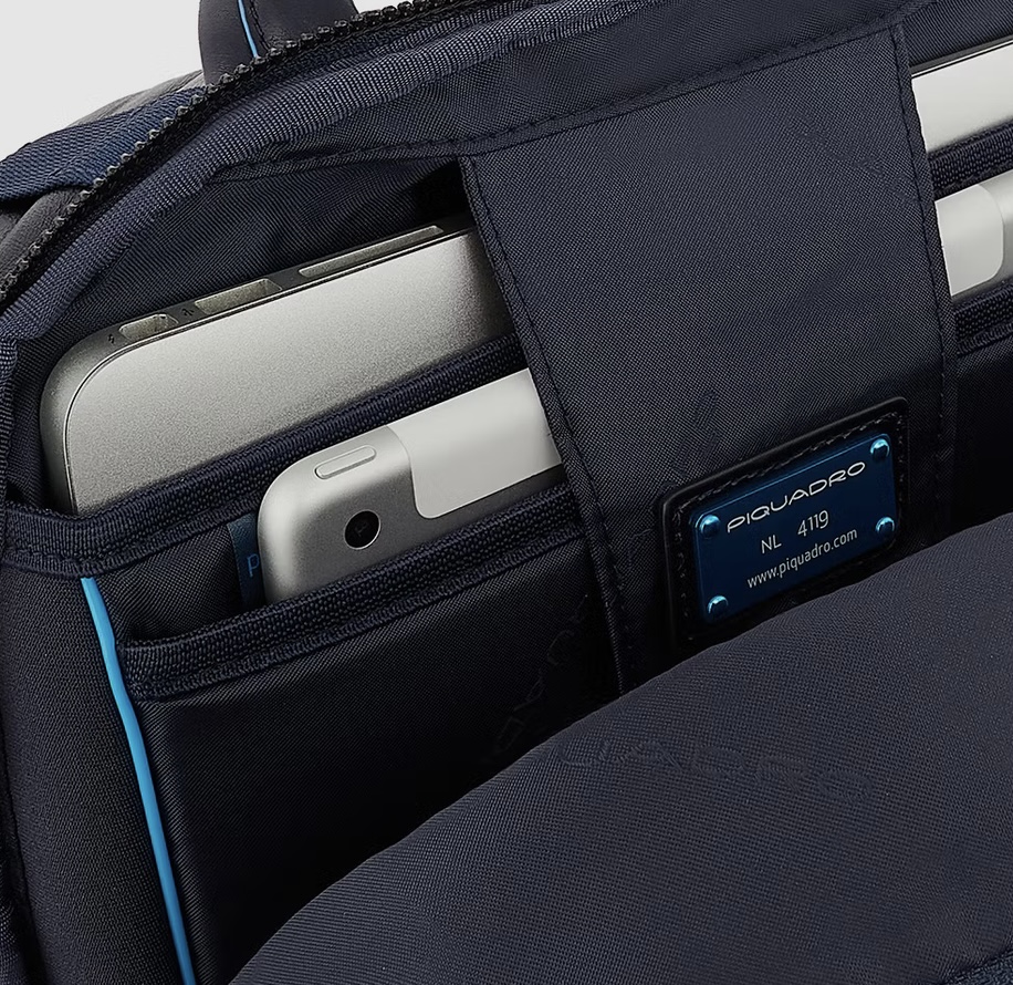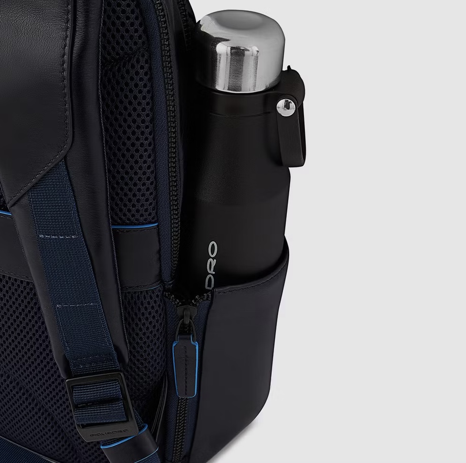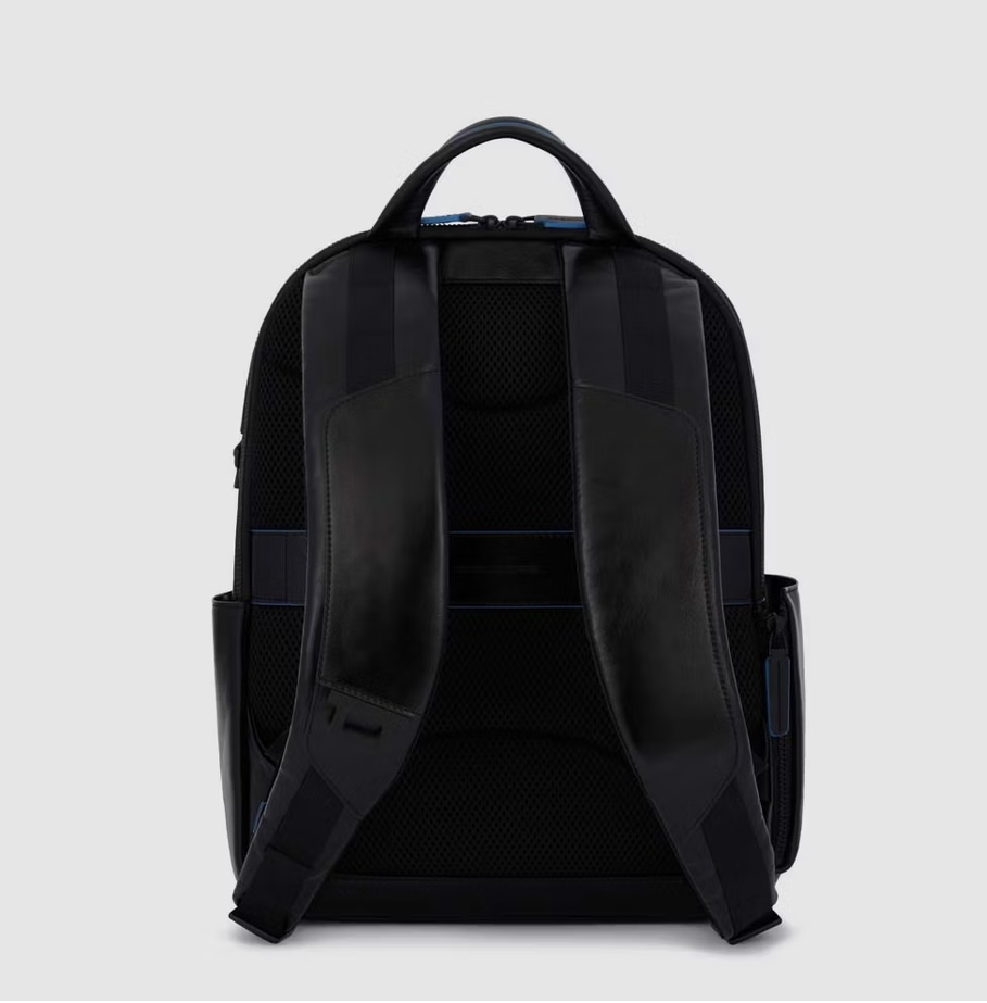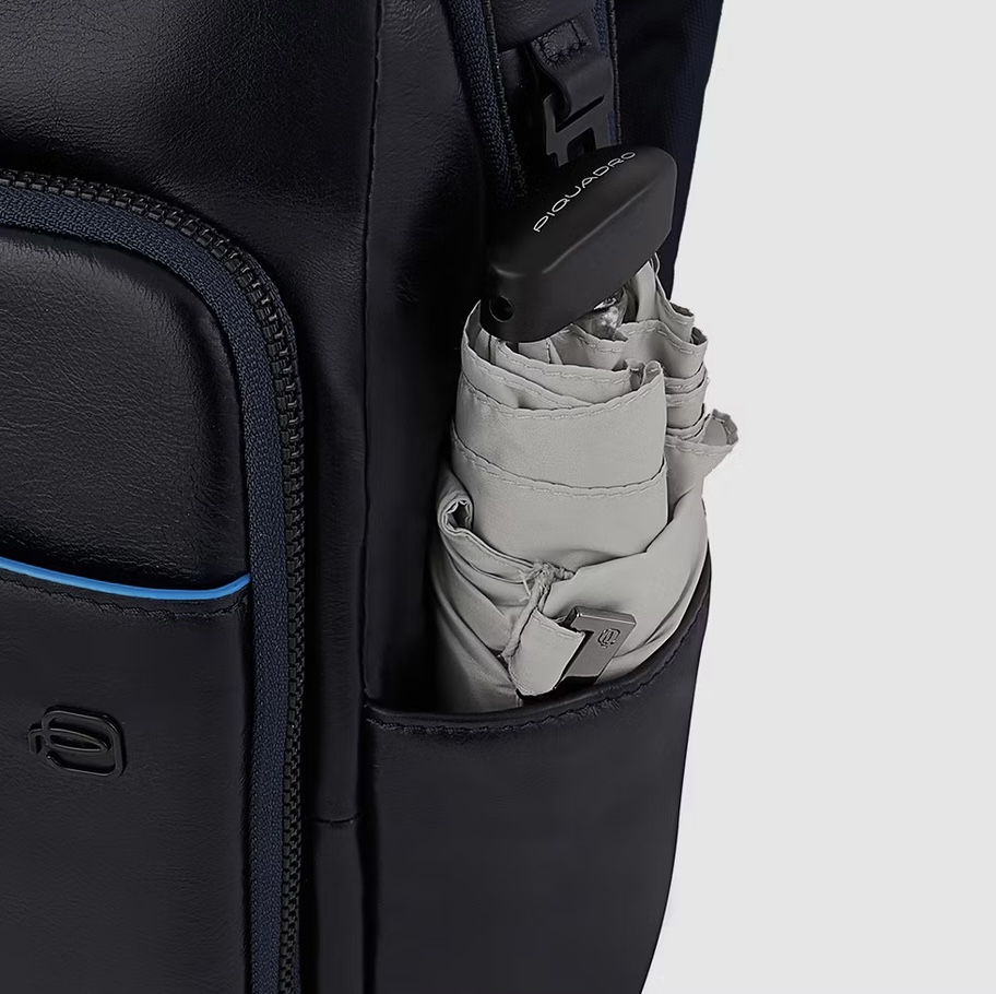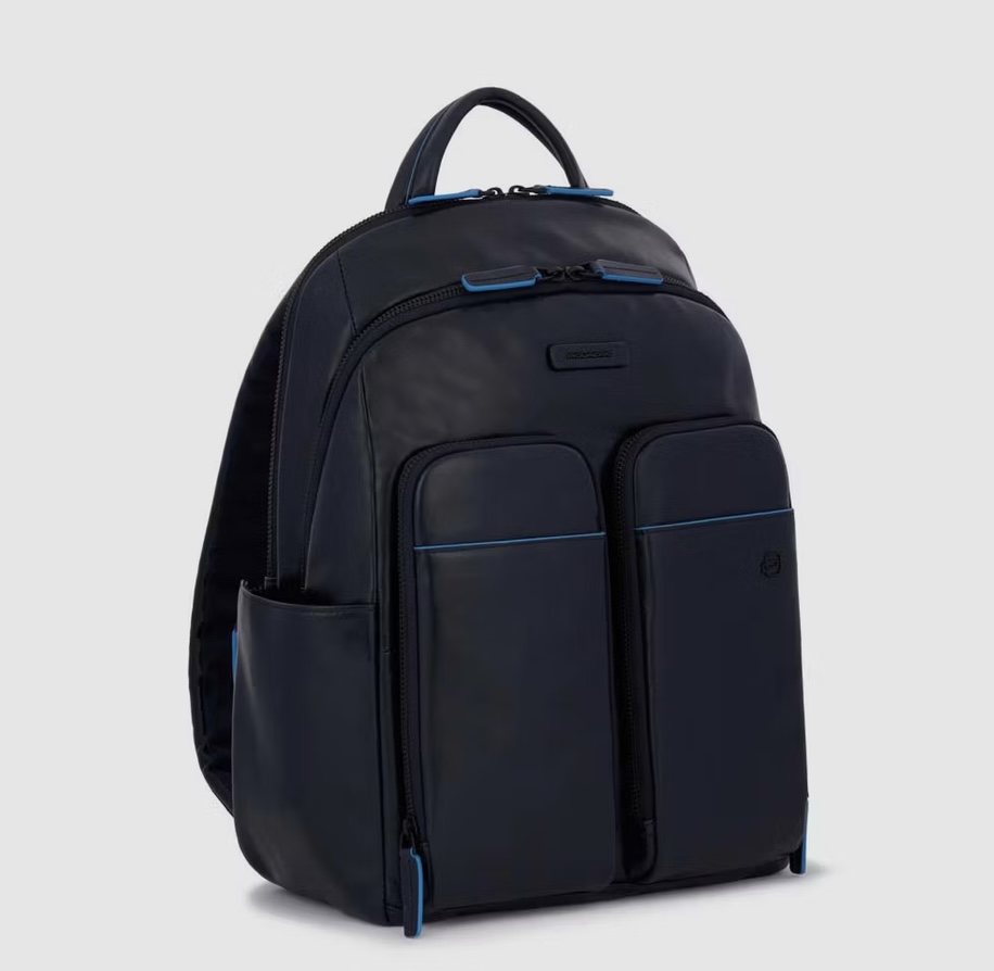 Zaino in pelle porta pc da 14". Chiuso da due zip, internamente imbottito per contenere il pc e tutti gli accessori work nei vari taschini. Sul davanti due tasche chiuse con cerniera, sullo schienale fascetta per agganciarlo al trolley e due tasche chiuse con zip sui lati per riporre l'ombrello o la borraccia.