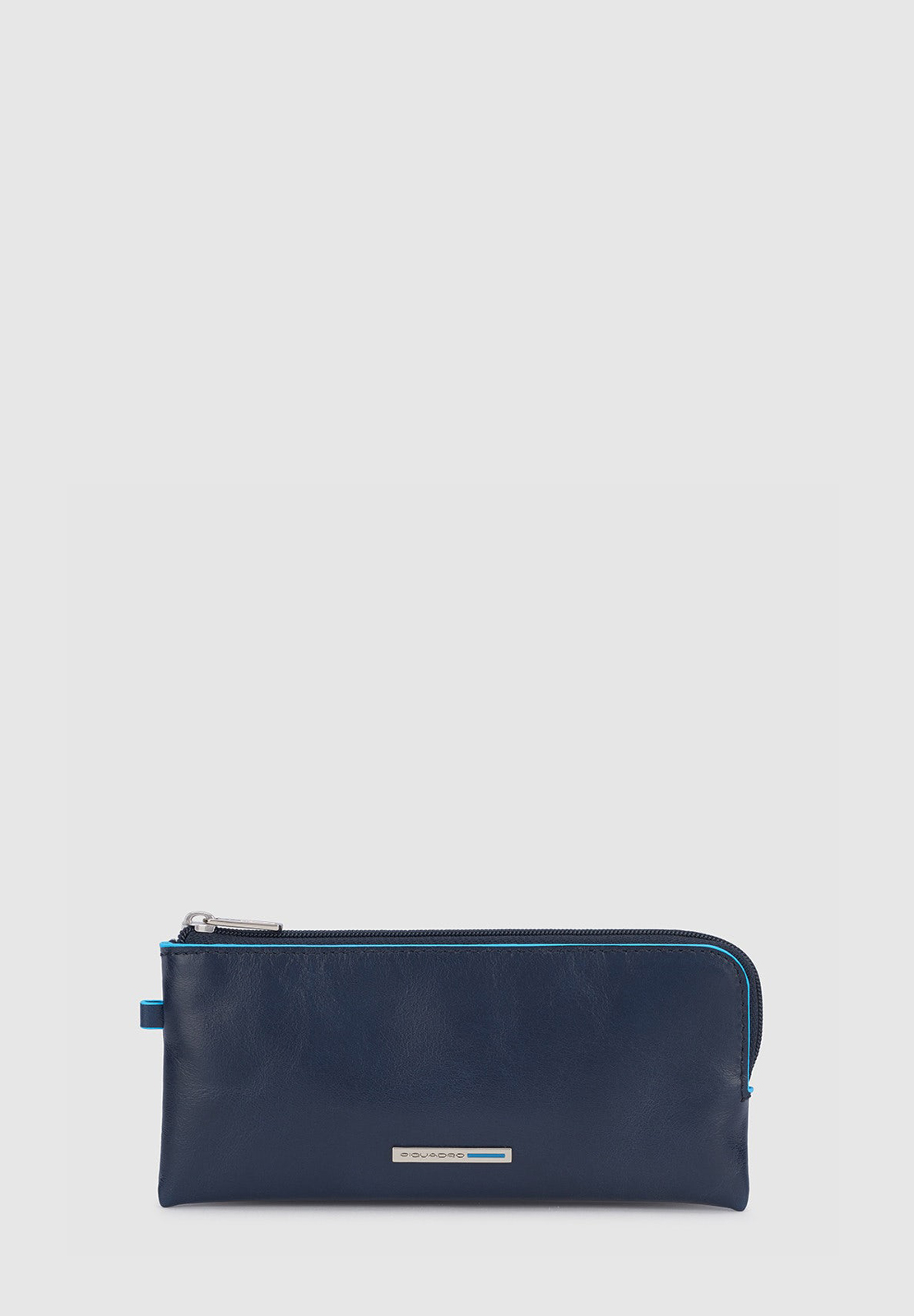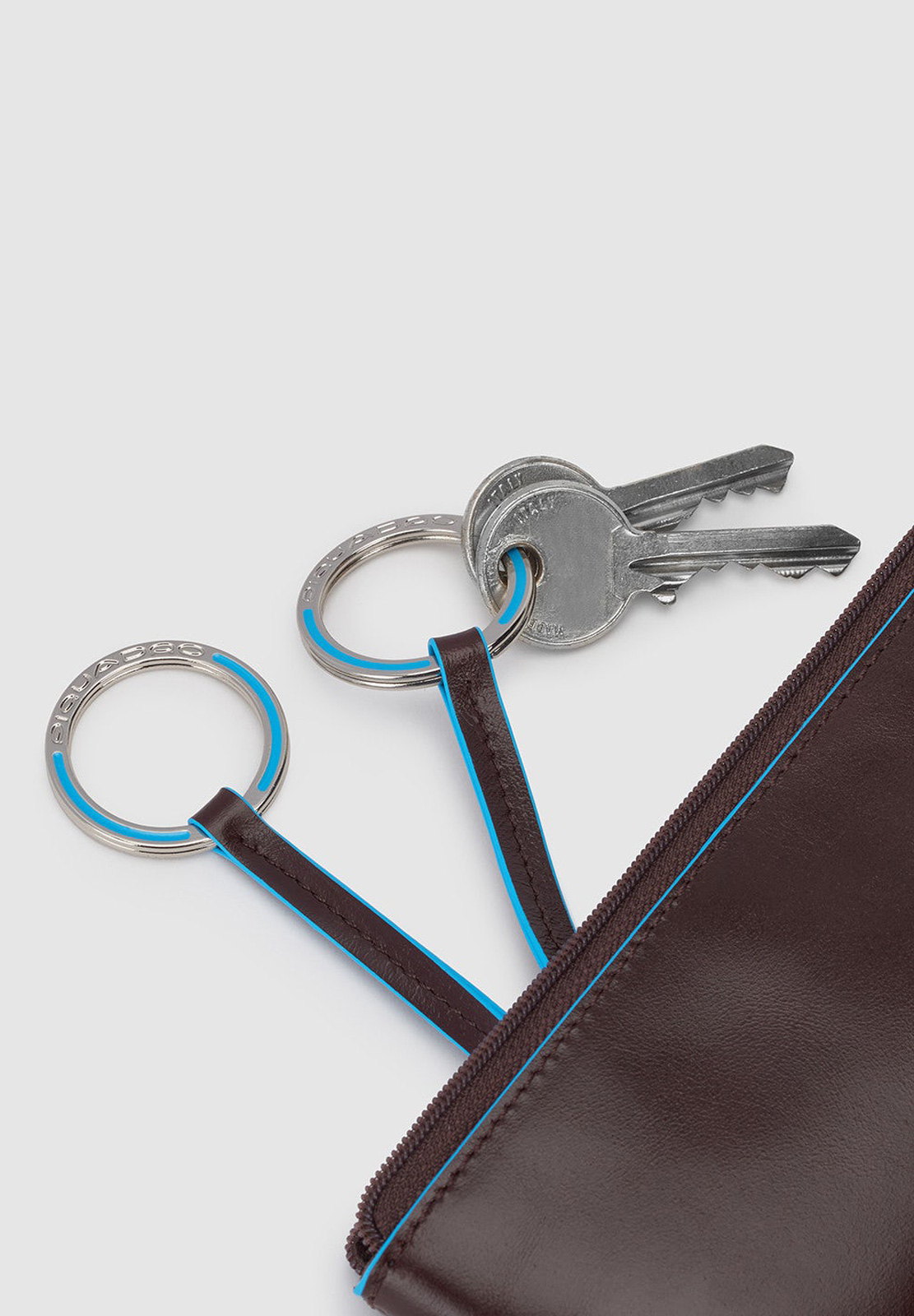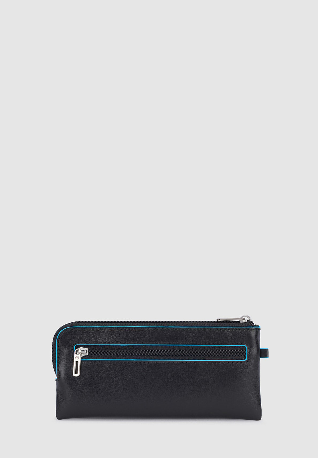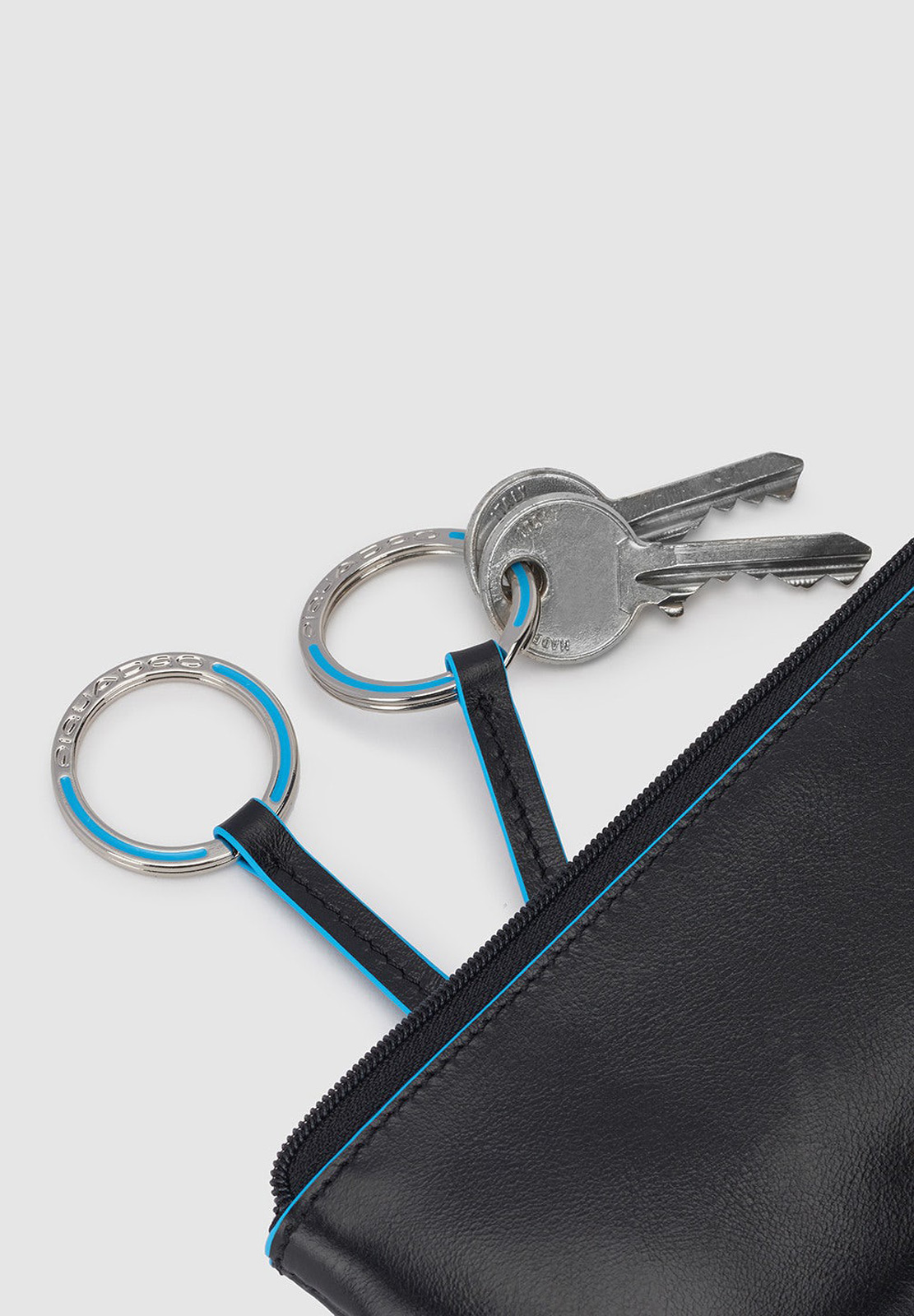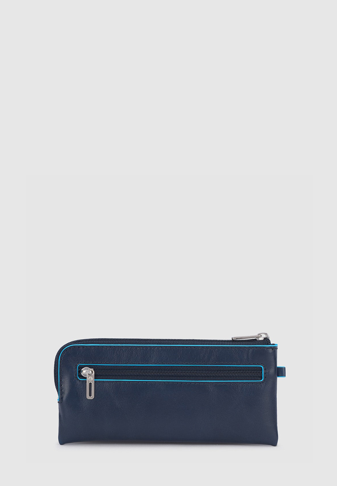 Portachiavi in pelle con il classico profilo azzurro, modello bustina chiuso con zip. All'interno due anelli portachiavi, all'esterno mini cerniera. Comodo non solo per le chiavi (anche quelle lunghe) ma anche come portamonete da borsa.