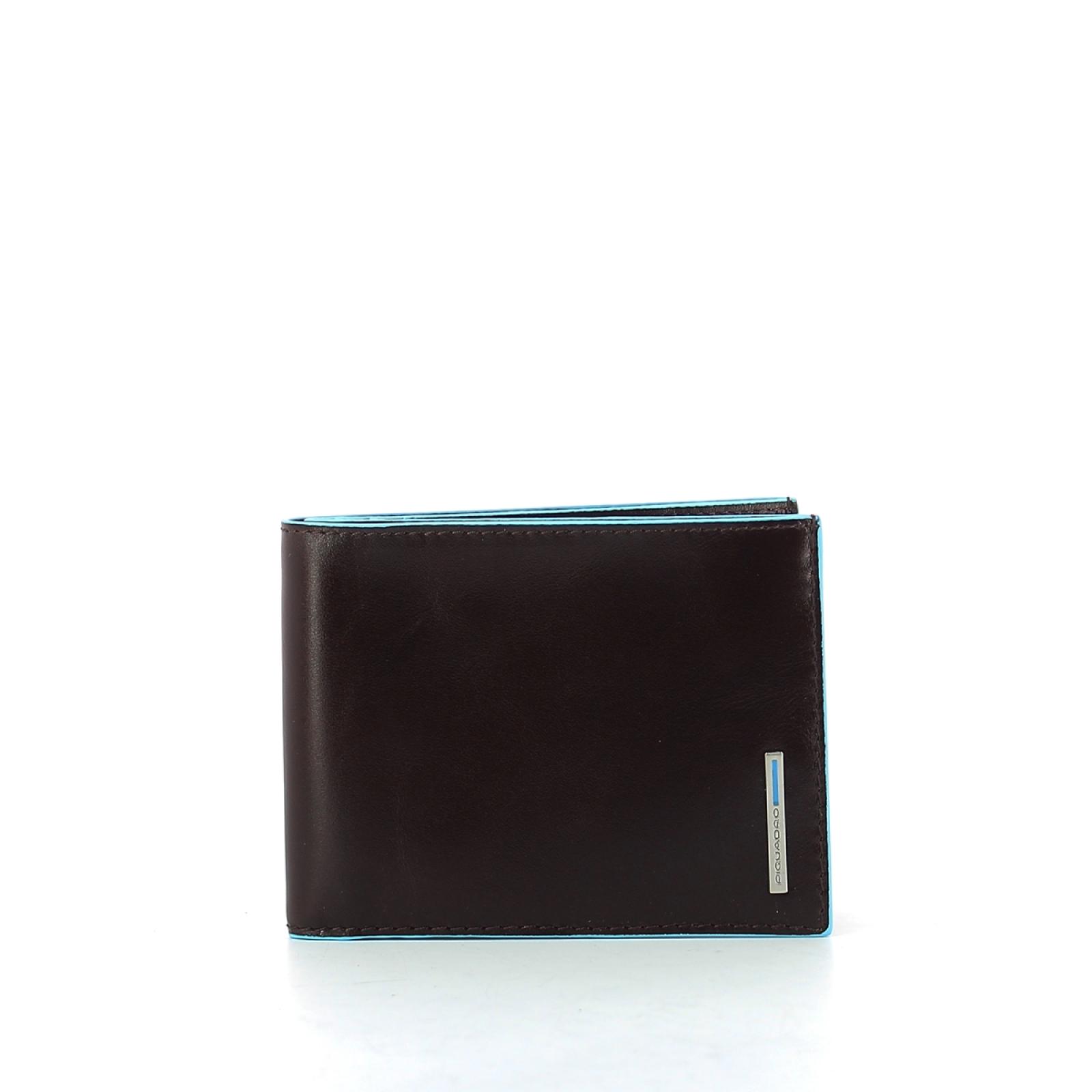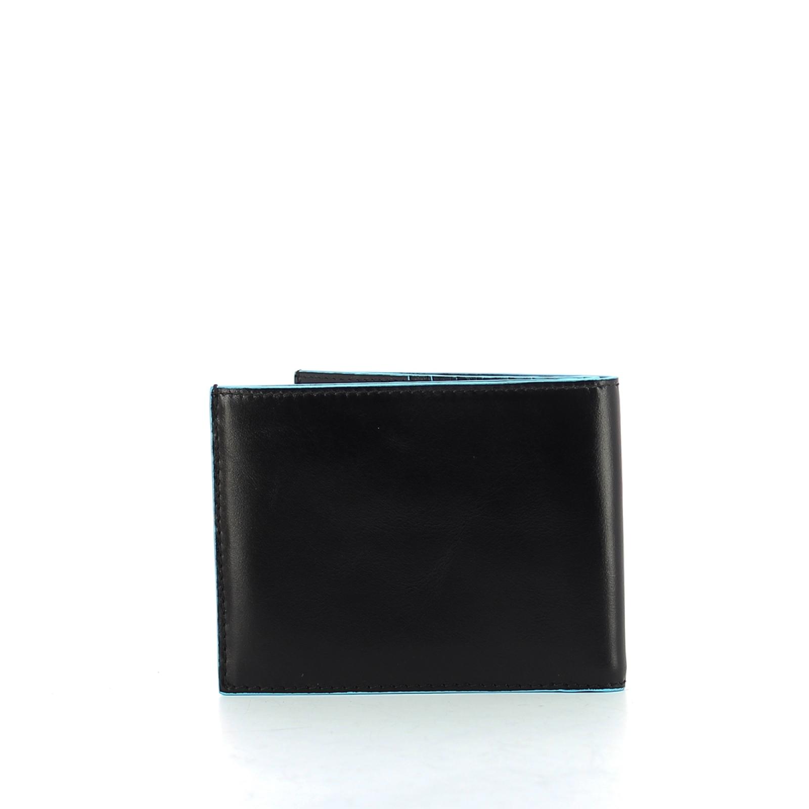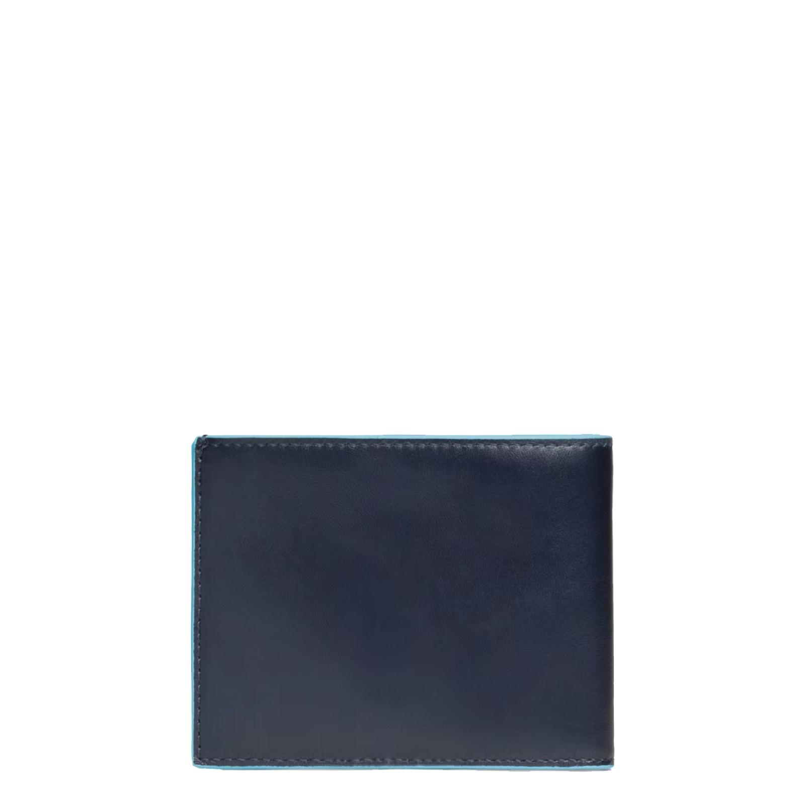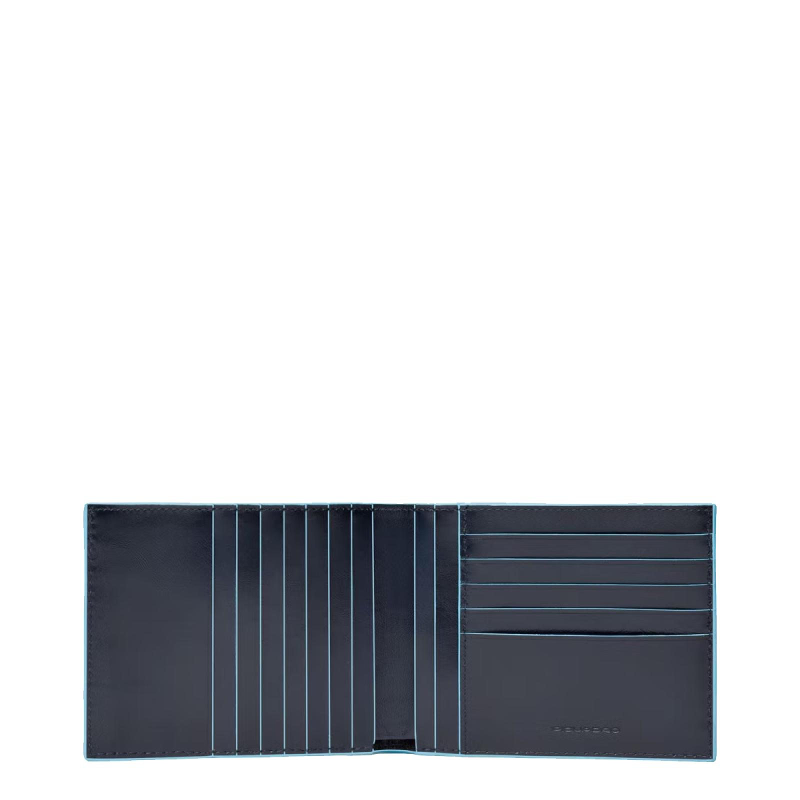 Portafoglio in pelle con i tipici profili azzurri. Dotato di doppio soffietto per le banconote e dodici slot per le carte di credito.