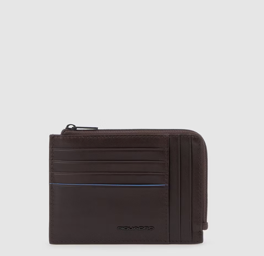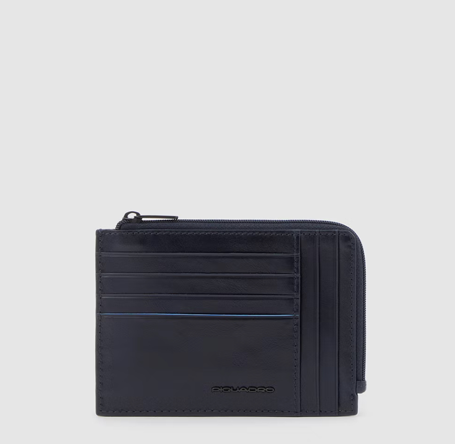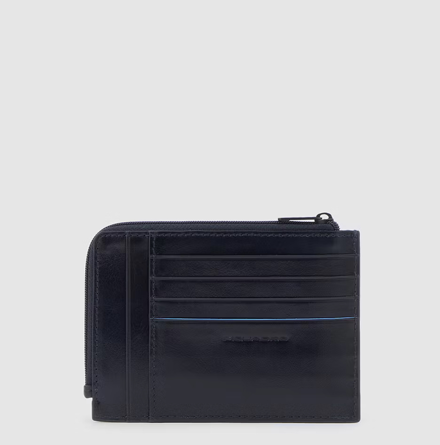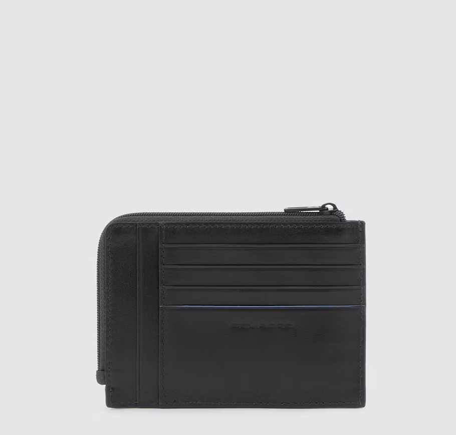 Portacarte in pelle con protezione antifrode RFID. Sia sul fronte che sul retro gli slot per le carte di credito e lateralmente chiuso con zip per riporre qualche moneta o banconota piegata.