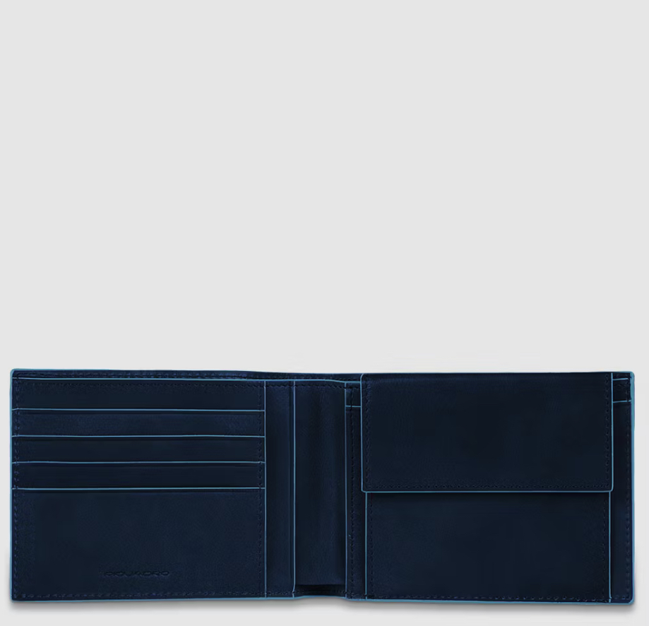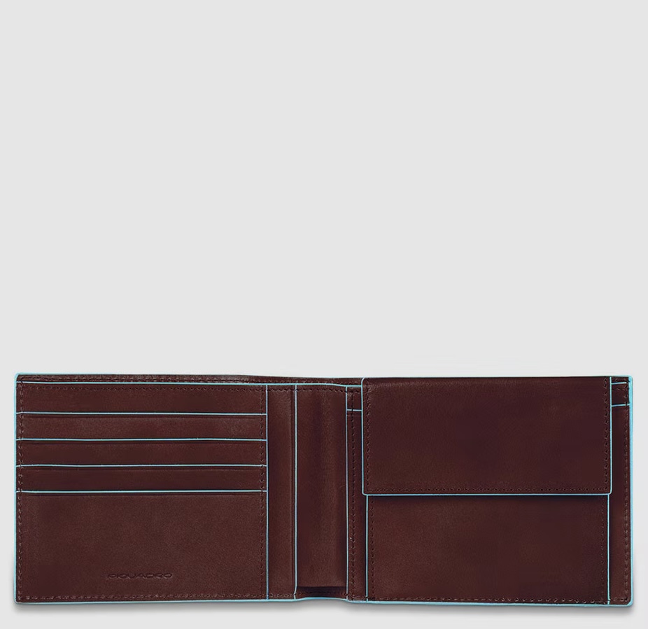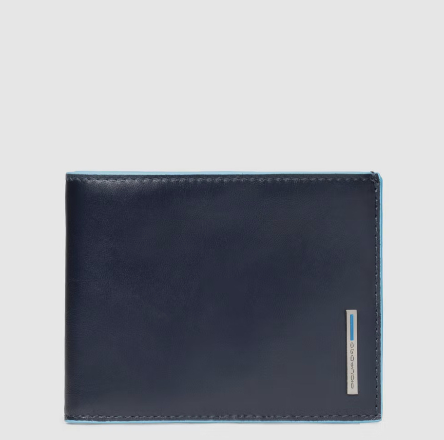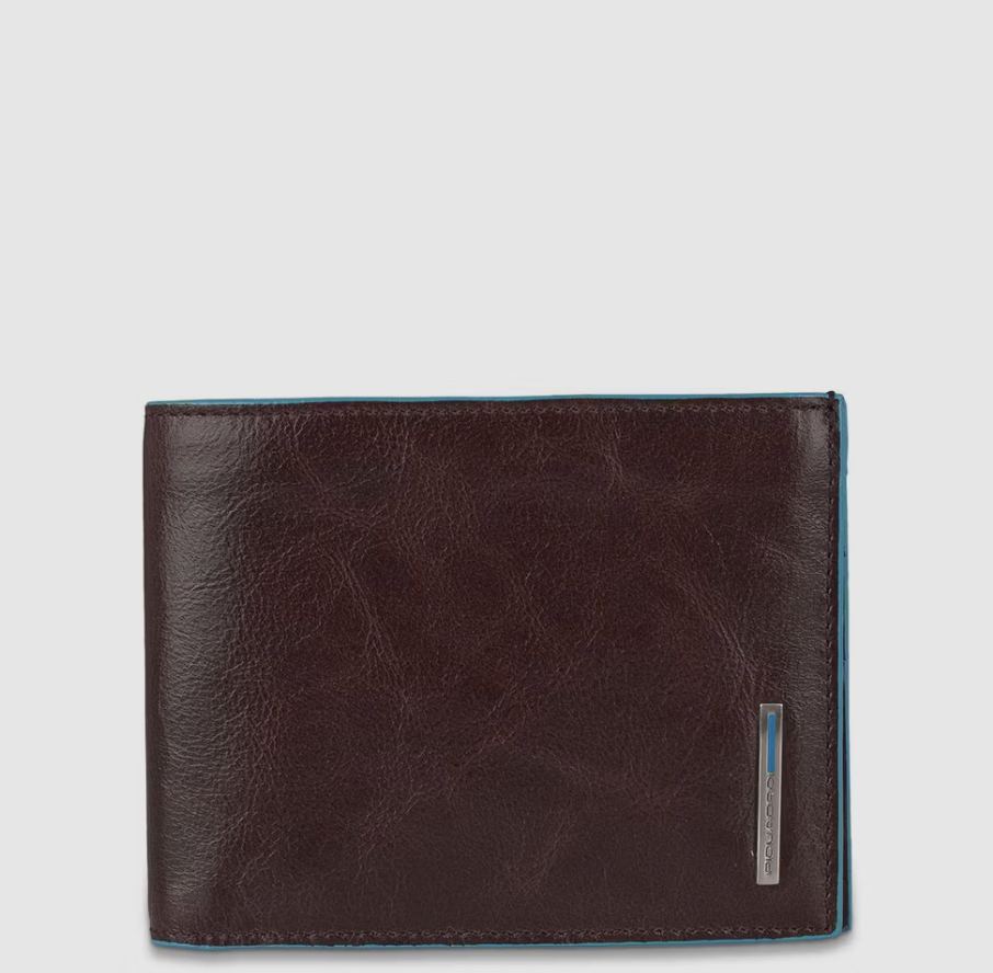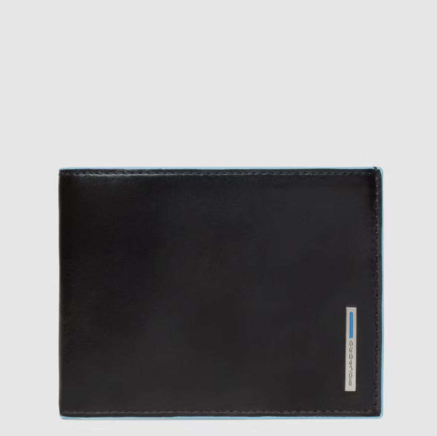 Portafoglio in pelle con protezione antifrode RFID. Due soffietti per le banconote, slot per le carte di credito e con portamonete.