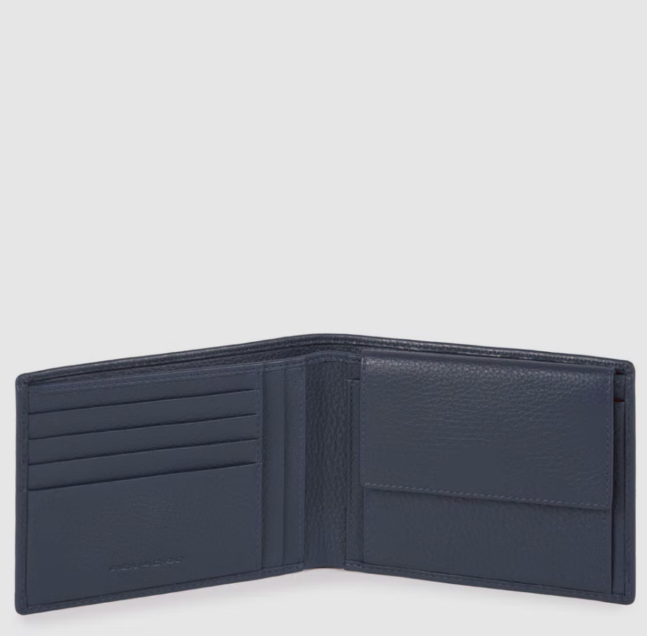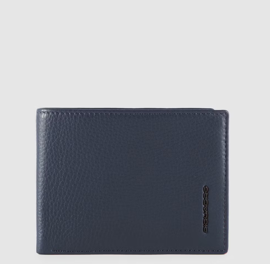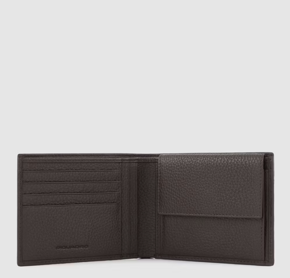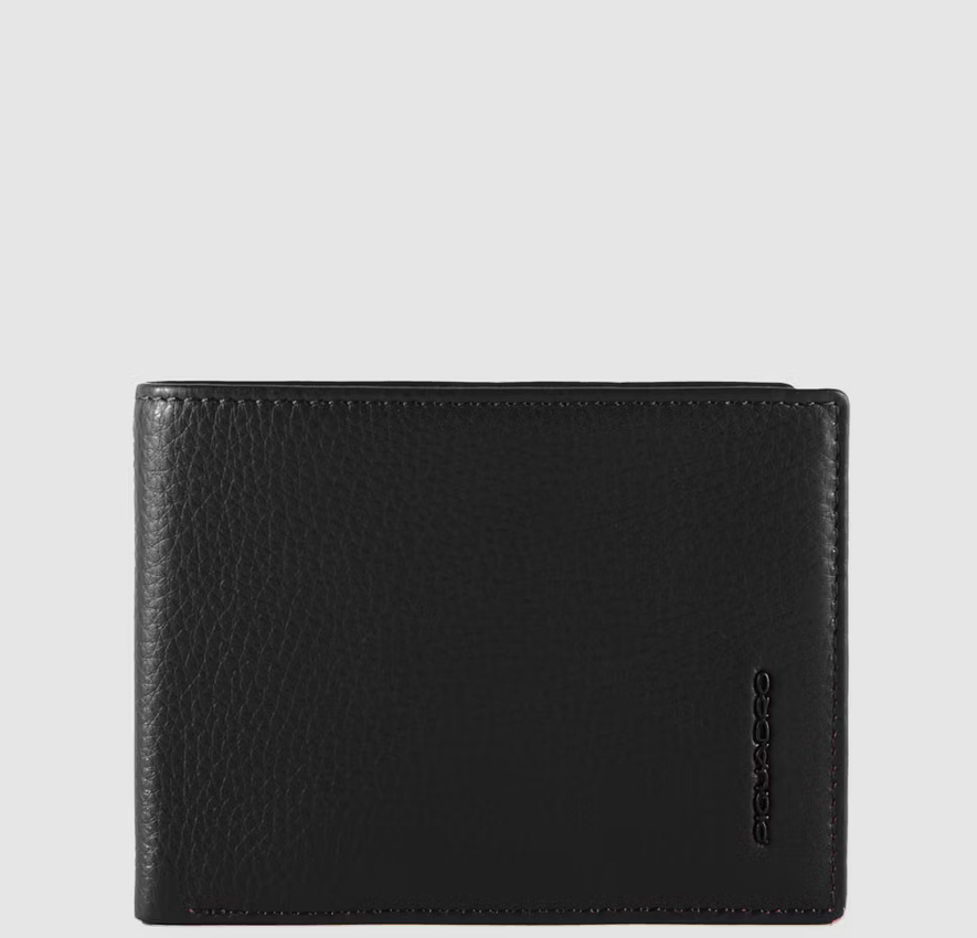 Portafoglio in pelle con protezione antifrode RFID. Due soffietti per le banconote, slot per le carte di credito e con portamonete.