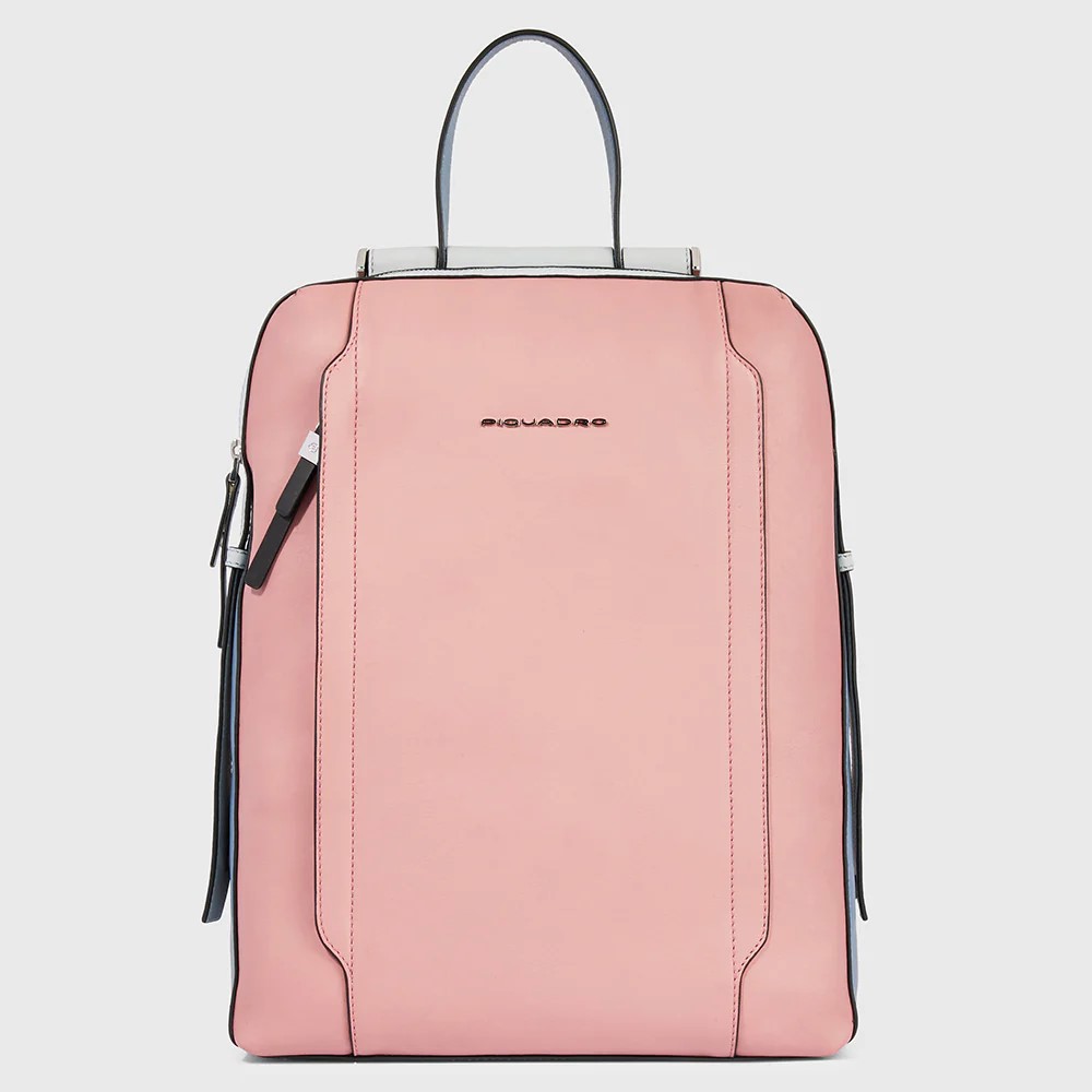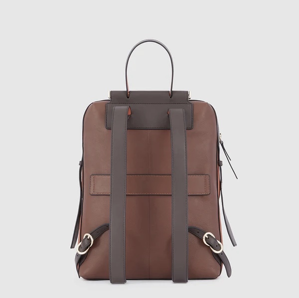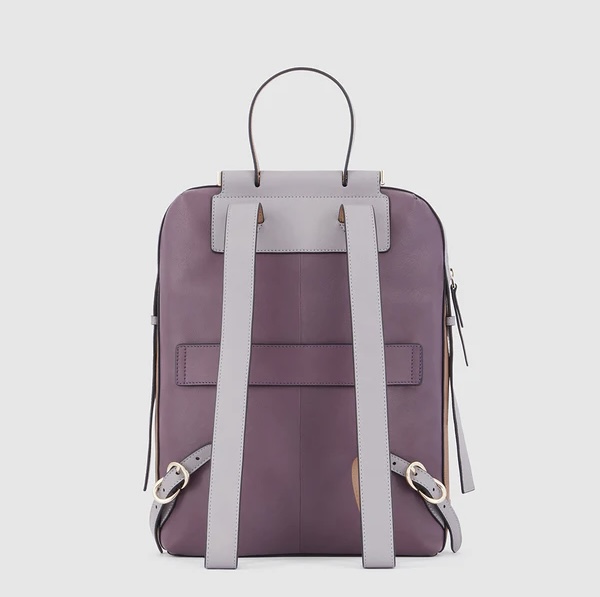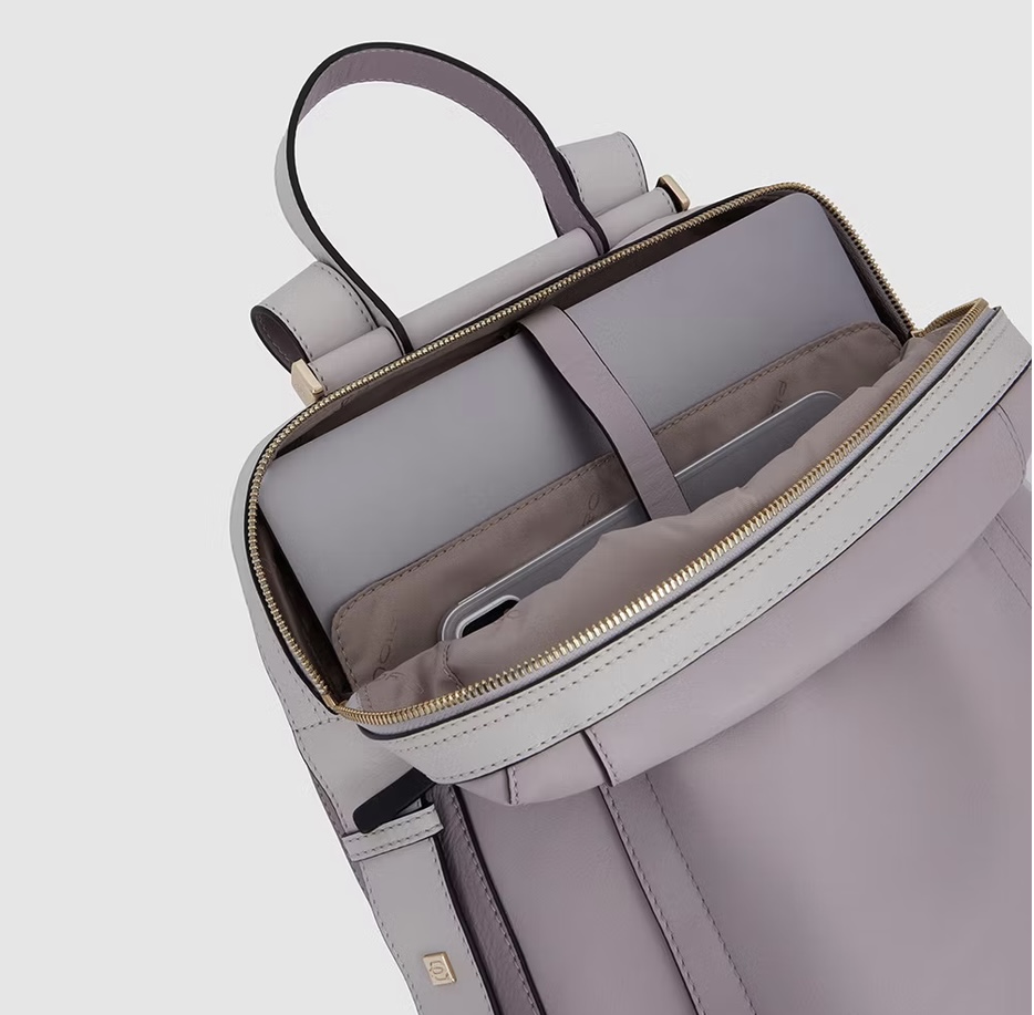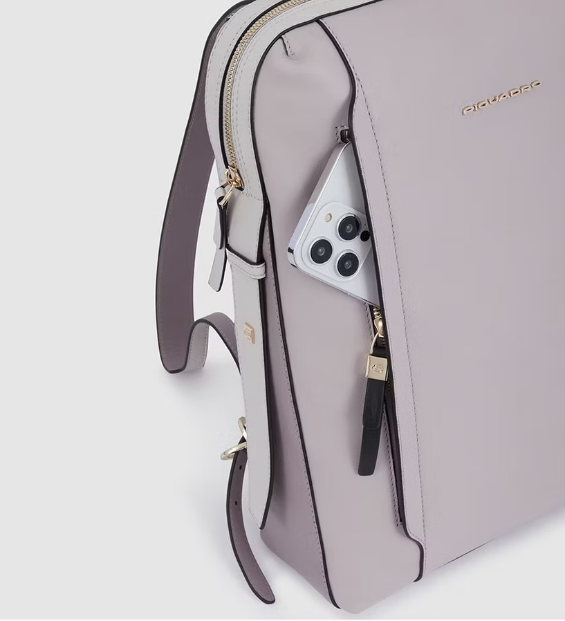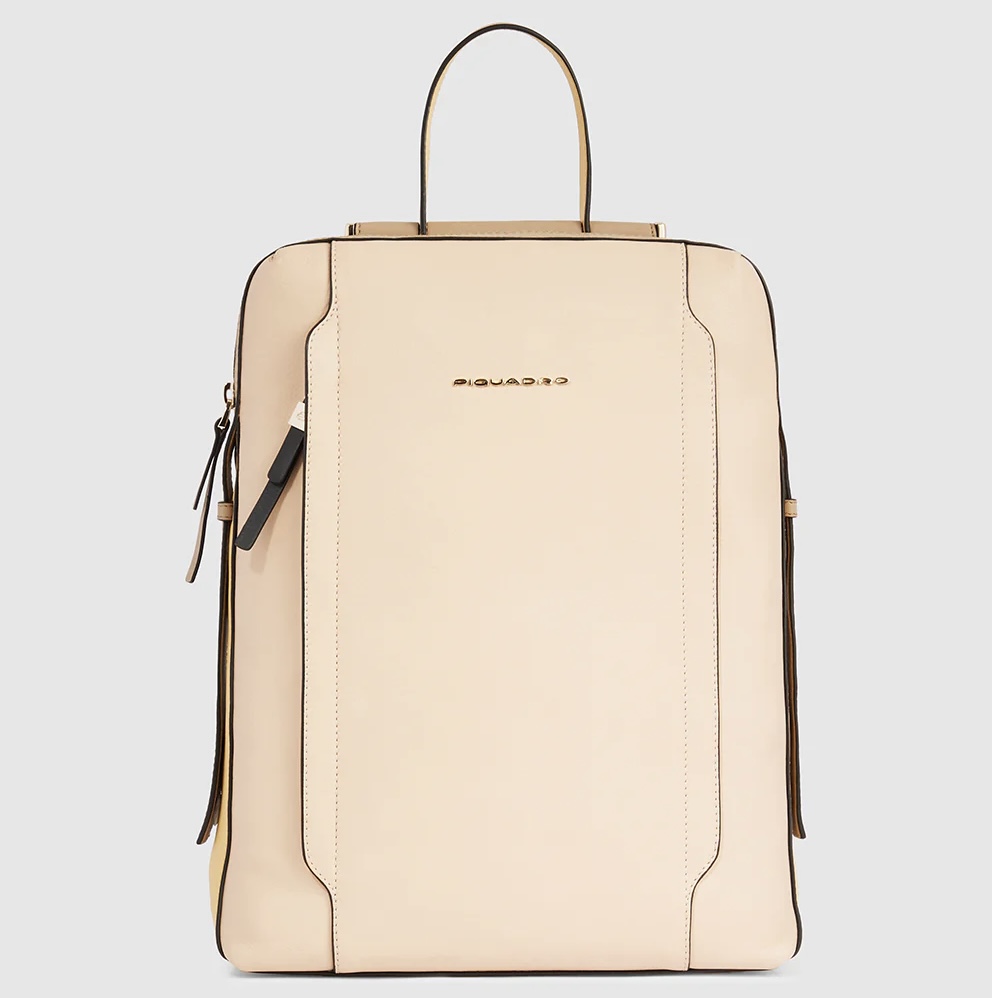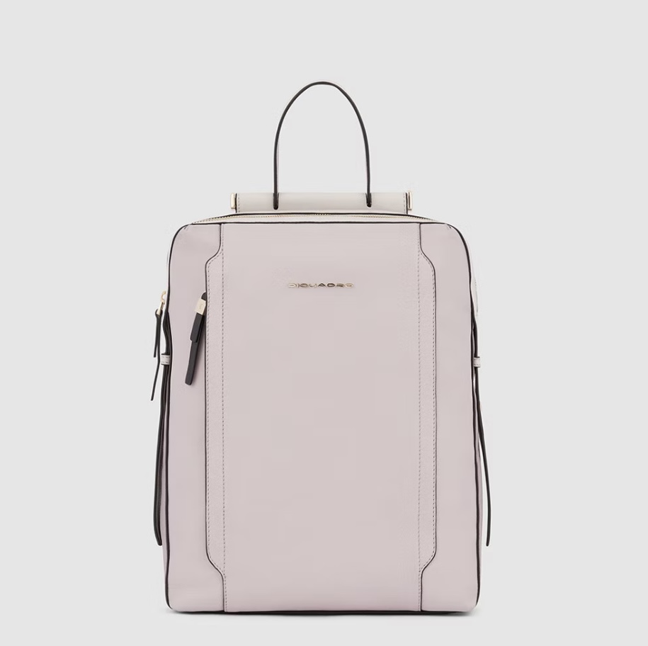 Zaino in pelle porta pc da 14". È un elegante e funzionale accessorio business donna; dotato di manichetto superiore e spallacci in pelle, con fascetta posteriore per aggancio a trolley. Internamente suddiviso in comode tasche imbottite per riporre gli oggetti personali. Comodo taschino frontale con cerniera.