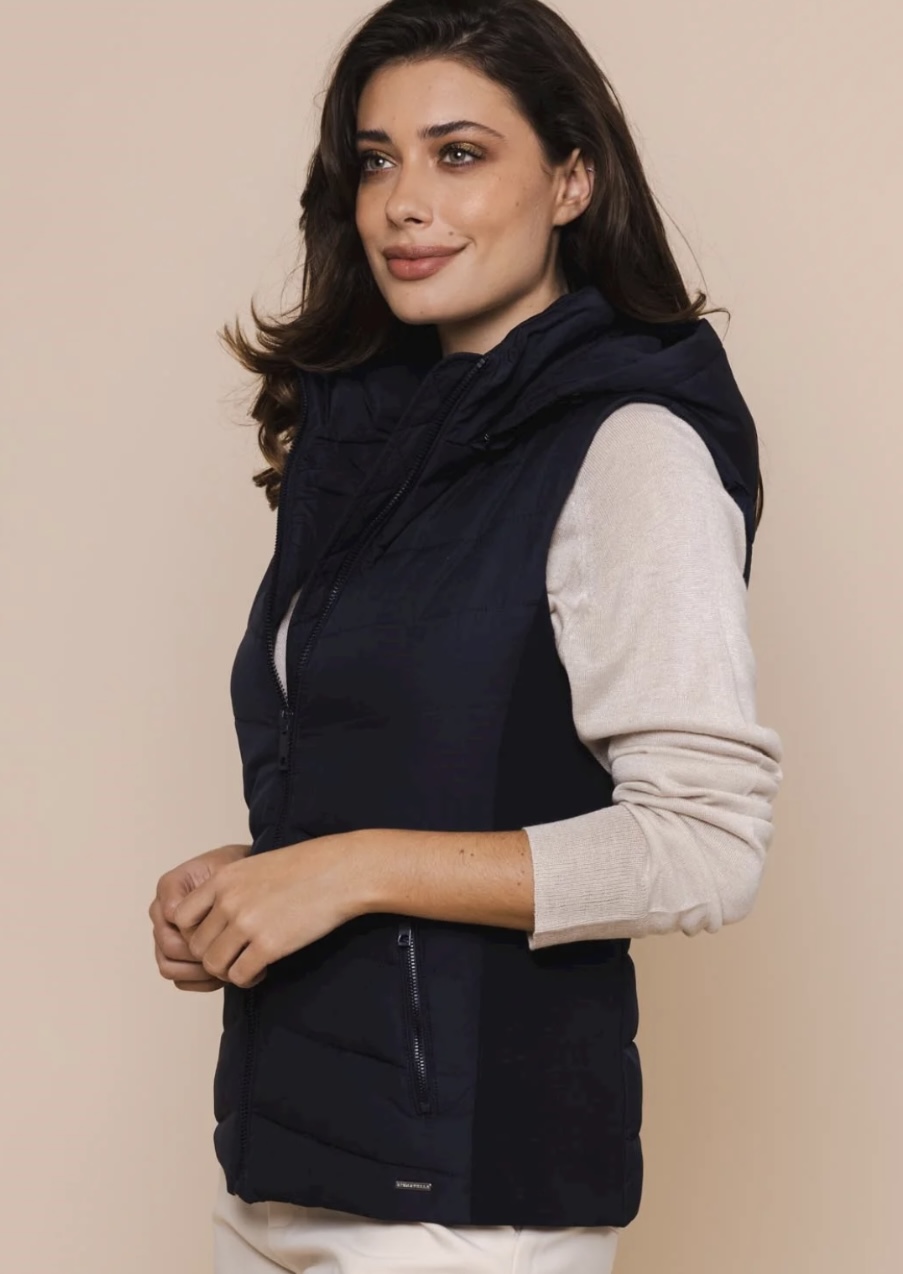 Smanicato piumino chiuso con zip, tasche laterali e cappucciolo removibile. La modella è alta 177cm ed indossa la taglia 38 (EU).