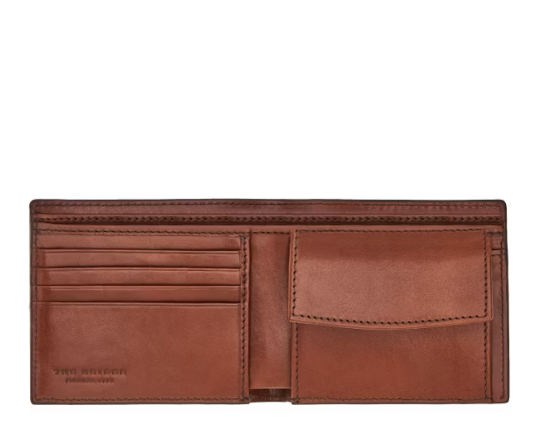 Portafoglio in cuoio con portamonete. All'interno doppio soffietto per le banconote, gli slot per le carte di credito ed il taschino chiuso con bottone con portamonete.