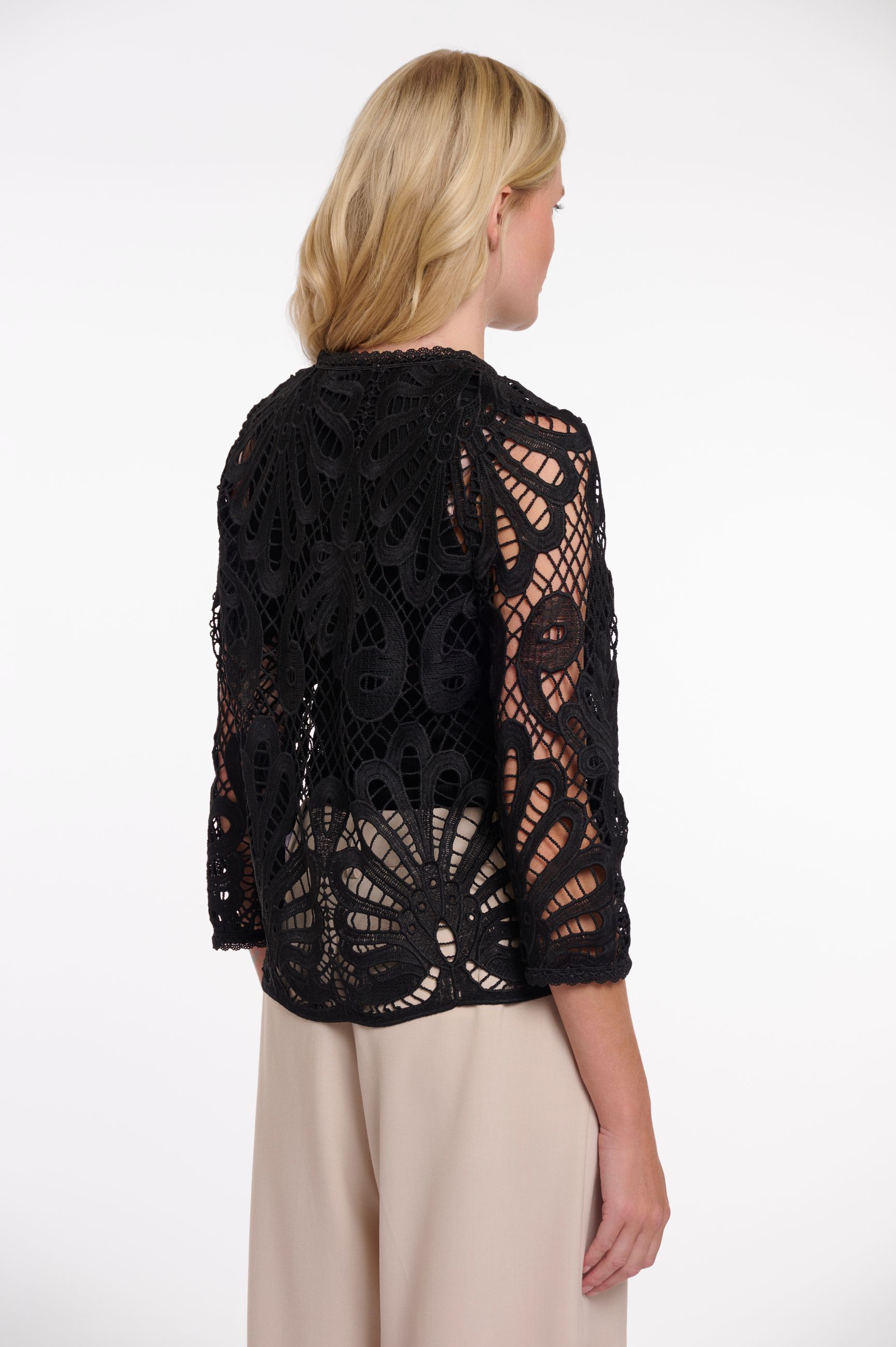 Eleva il tuo stile con il bolero Meghan firmato Rino&Pelle, un capo che fonde sapientemente texture ricercate e silhouette pulite. Realizzato in un delicato pizzo che si distingue per l'intricato ricamo traforato che aggiunge un tocco sofisticato e leggero a ogni abbinamento. Silhouette corta (stile bolero) pensata per valorizzare la figura senza appesantirla. Lunghezza della manica a 3/4 ideale per le stagioni intermedie o per aggiungere un layer elegante a un abito senza maniche. Presenta una discreta chiusura frontale con gancetto (hook-and-eye) che mantiene la linea pulita e minimale. Perfetto come coprispalle su abiti da cerimonia o sopra top strutturati per un look casual-chic.